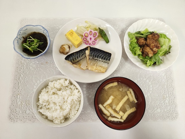 鯖の塩焼き・タコ唐揚げ・もずくと野菜のごま酢和え