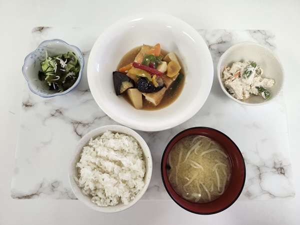 茄子とツナのトマトパスタ・がんも煮物・マカロニサラダ・味噌汁