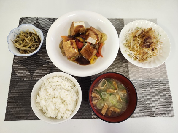 厚揚げと野菜の炒め物・もやし磯和え・大根サラダ