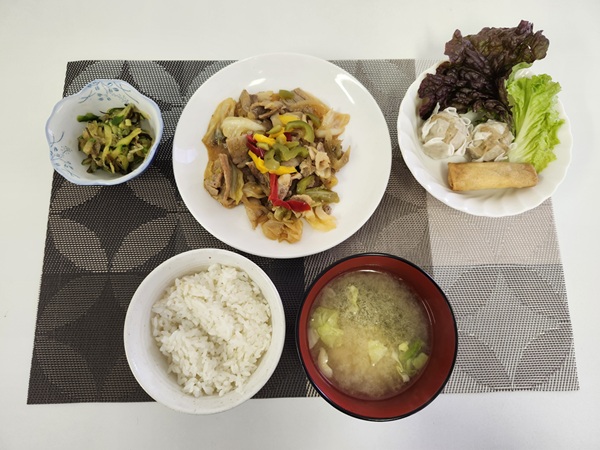 豚肉とキャベツのニンニク醤油炒め・春巻き・焼売・きゅうりの昆布和え