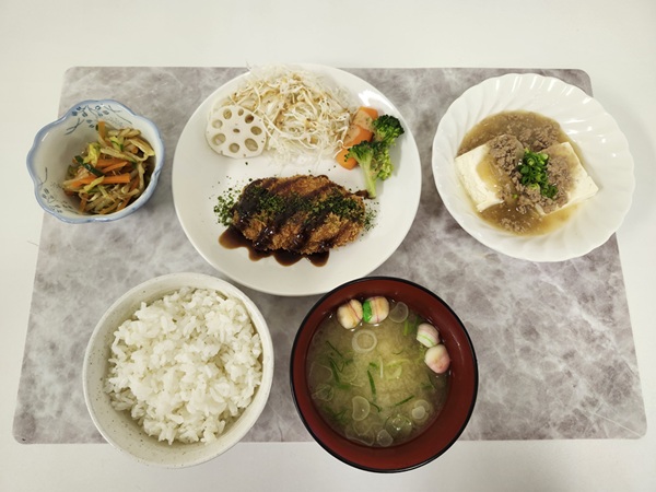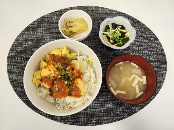 エビチリソース丼・しめじ天・長いもポン酢・味噌汁