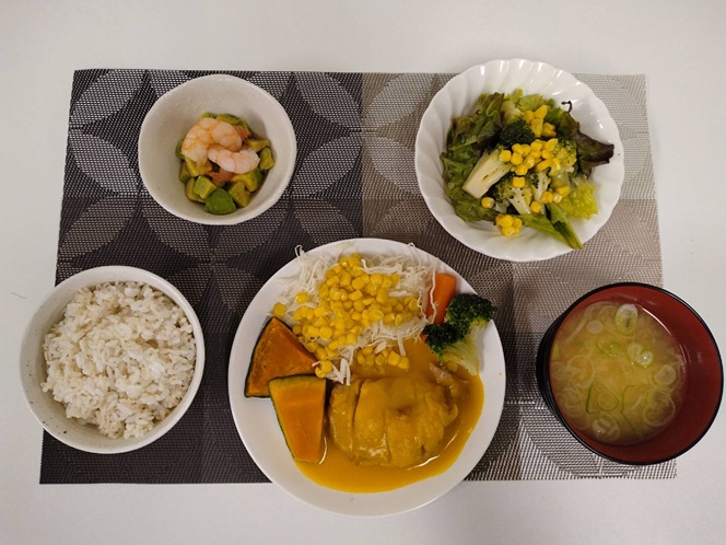 チキンソテー~南瓜ソース~・エビアボカドサラダ・ブロッコリーコーン和え