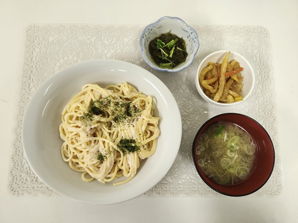 たらこパスタ・じゃがいもきんぴら・めかぶ・味噌汁