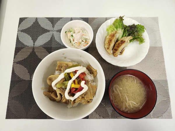 豚甘辛チーズ丼・揚げ餃子・蒸し鶏と野菜のマヨ和え・味噌汁