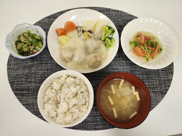 肉団子クリーム煮・豆苗とトマトのナムル・オクラおかか和え