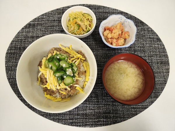 そぼろ丼・春雨カレー炒め・カリフラワーと桜エビの和え物・味噌汁