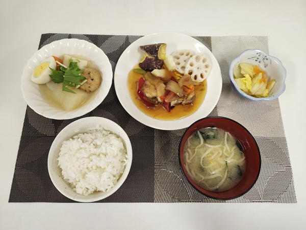 鶏とさつまいもとレンコン甘辛あん・関東風おでん・白菜の柚子胡椒和え