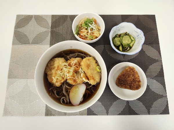 鶏天そば・切干大根・きゅうりの昆布和え・焼きおにぎり