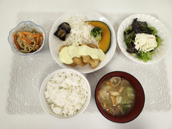 鶏天わさびマヨ・レンコンこんにゃく炒め・スパゲティーサラダ