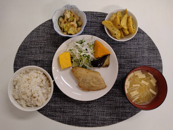 ホッケ西京焼き・ちくわとピーマンのおかか炒め・青のりポテト