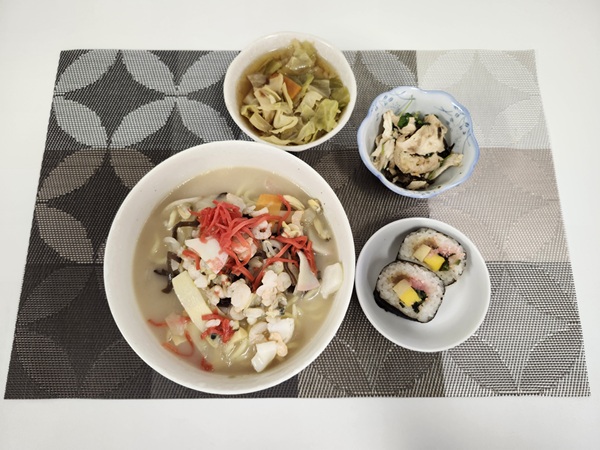 ちゃんぽん麺・キャベツとちくわの煮びたし・鶏と豆苗の昆布和え・のり巻き