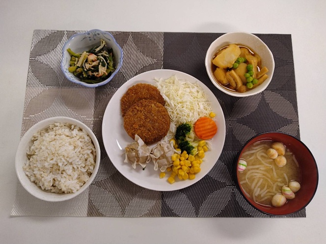 ハムカツ&焼売・じゃがいもと油揚げの煮物・小松菜のお浸し