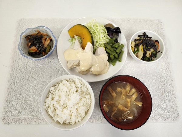 蒸し鶏梅マヨソース・ちくわの甘辛炒め・きゅうりの胡麻キムチ和え