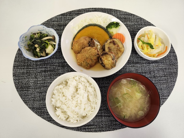 茄子はさみ揚げ&椎茸肉詰めフライ・きのことほうれん草のソテー・白菜ピーナッツ和え