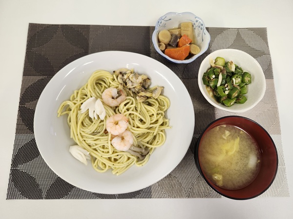 シーフードジェノベーゼパスタ・五目煮・オクラと長芋のおかか和え・味噌汁