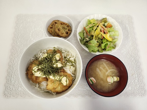 鶏天タルタル丼・レンコンの磯辺揚げ・アボカドサラダ・味噌汁