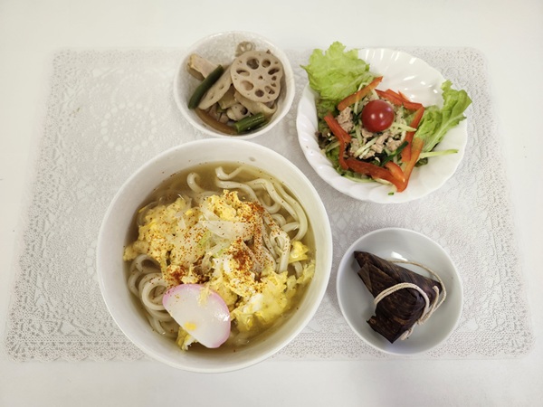 玉子とじうどん・五目炒め・ツナマヨサラダ・ちまき