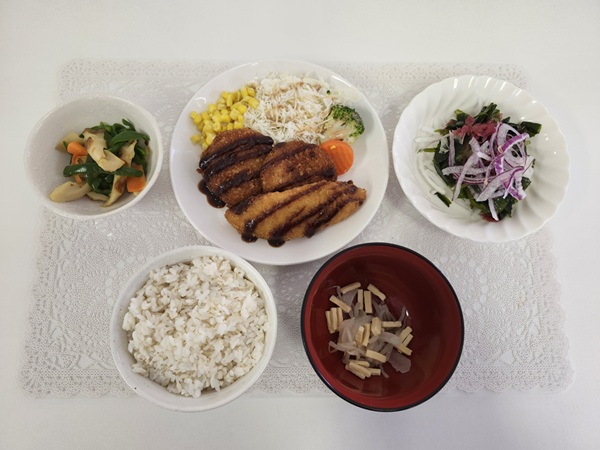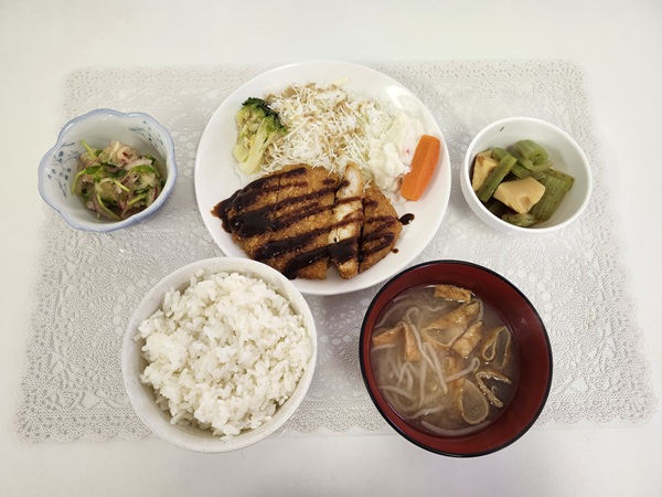 とんかつ・ふきとたけのこの土佐煮・玉ねぎ和風和え