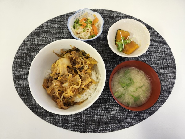 キムチ豚丼・南瓜の煮物・もやしのさっぱり和え・味噌汁