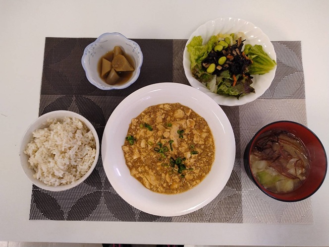 麻婆豆腐・ごぼうのごま味噌煮・枝豆とひじきのサラダ