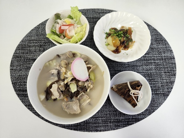 チャンポン麺・ホタテとじゃがいもの照り焼き・ハムマリネ・ちまき